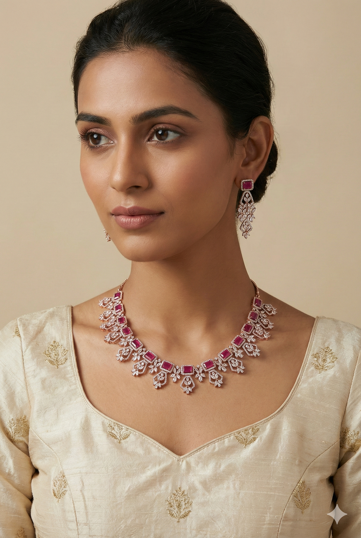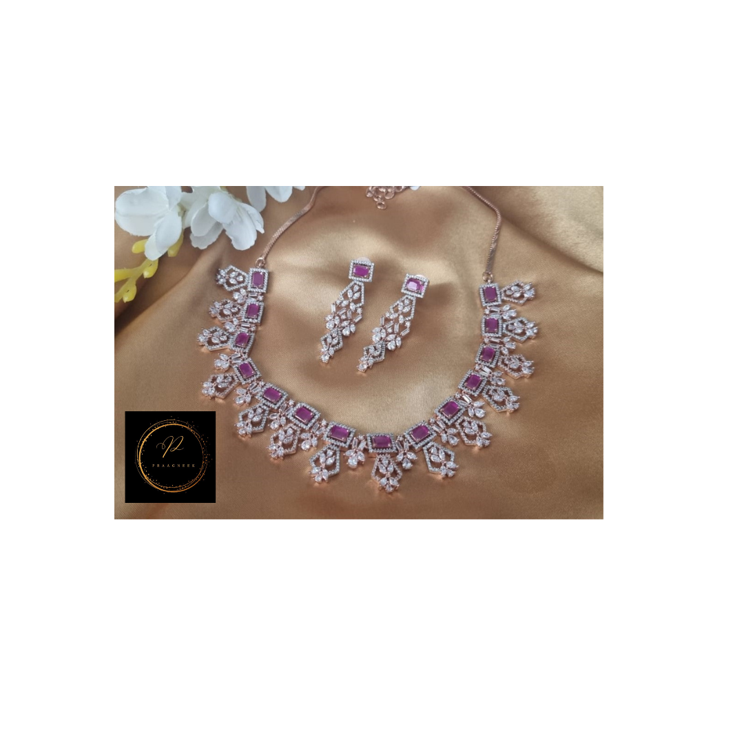 American diamonds and Red stones in an ethnic design in a short necklace in rose gold plating with earrings