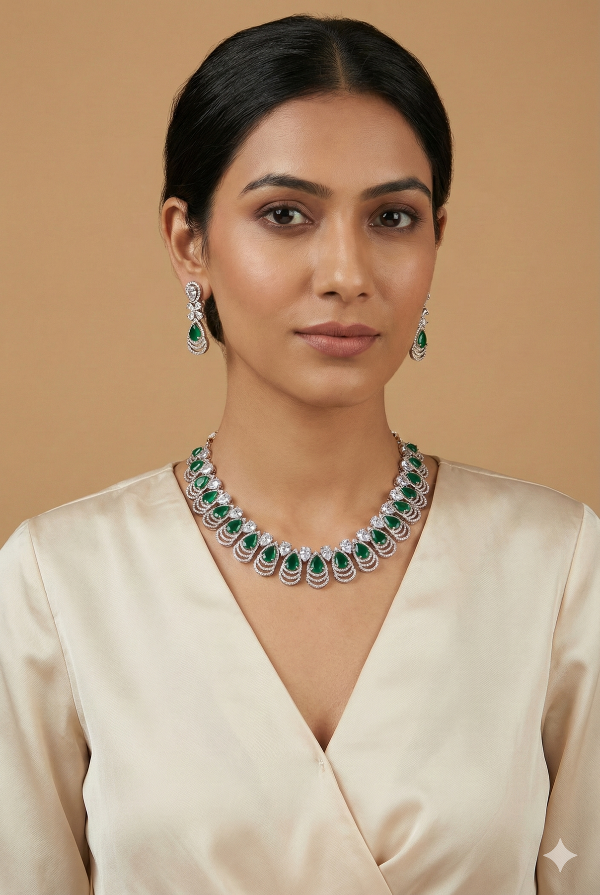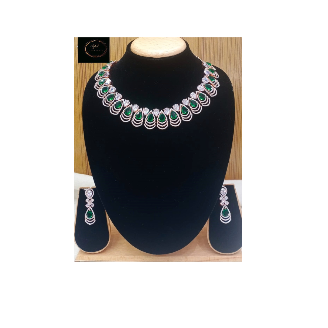 American diamond white diamonds and green emerald stones choker in rose gold plating with earrings