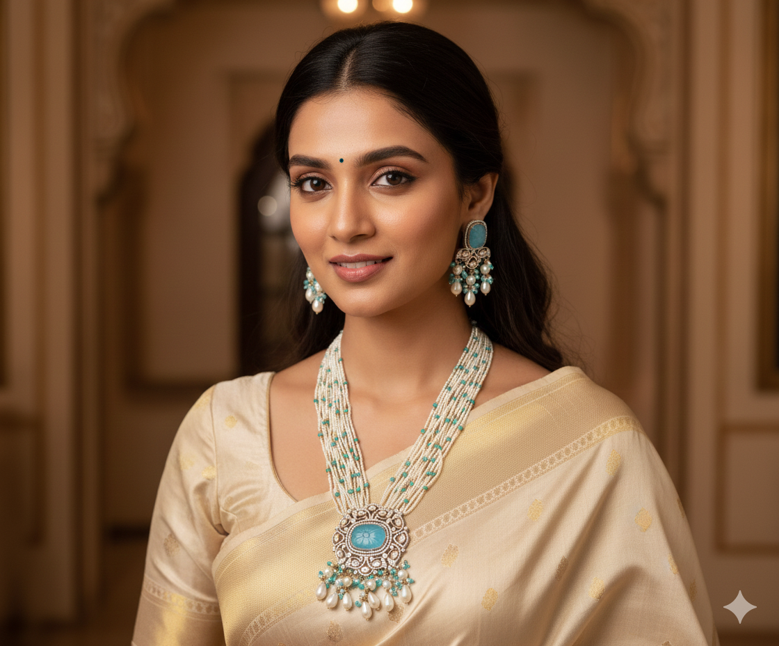 Experience sheer elegance with our CZ Diamond Necklace Set adorned with rare Moissanite blue stones, American Diamonds, Monalisa stones, pearls, and beads. This exquisite jewelry ensemble includes matching earrings to complete your look.