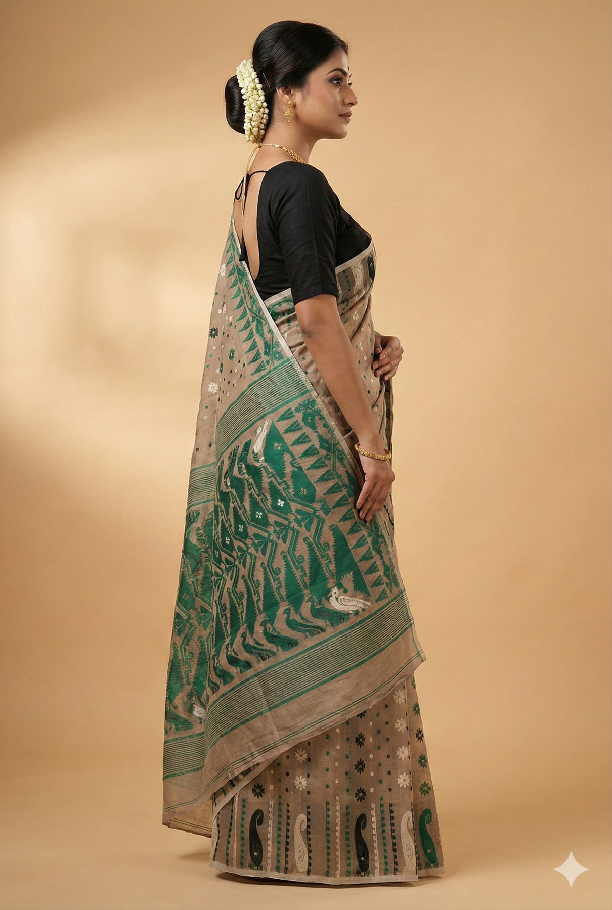 Beige & Green Pure Handloom Resham Jamdani Cotton Saree | Soft Dhakai Weave – Praagneek