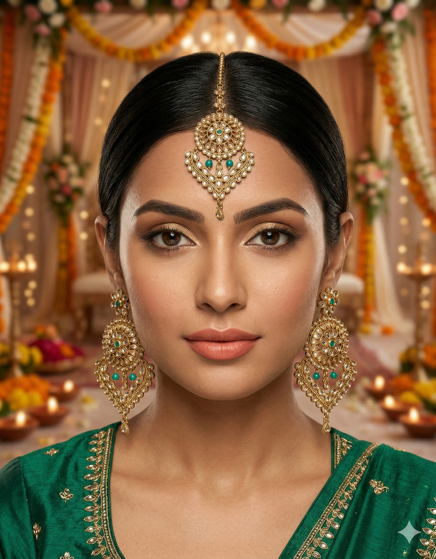 A beautiful earring with matching maang tikka/pasa set in kundan and green beads with gold plating.