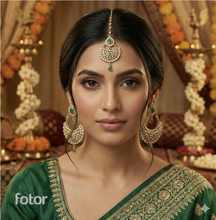 A beautiful earring with matching maang tikka set in kundan and green stones and beads with gold plating.