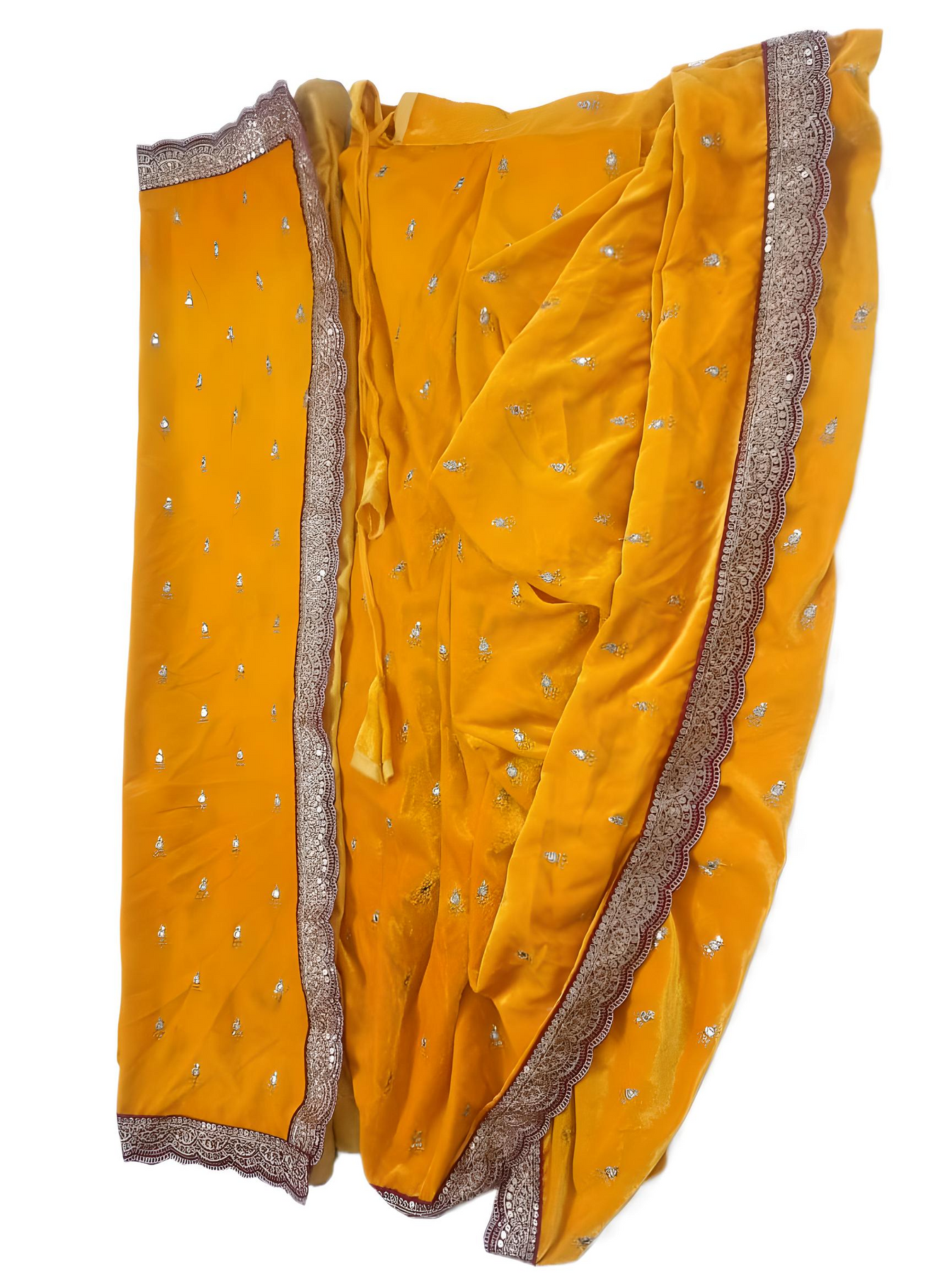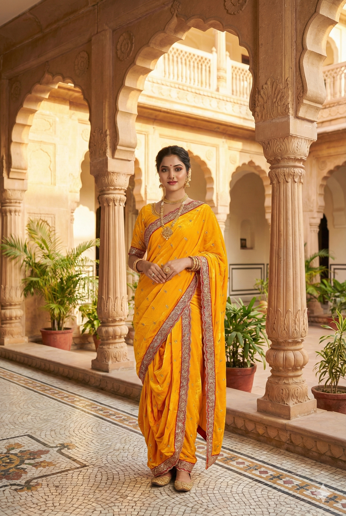 Description: Embrace the regal elegance of Maharashtra with our Yellow Velvet Peshwai Nauvari Saree. Designed for the modern woman who values tradition but desires convenience, this saree comes pre-stitched, allowing you to wear the traditional 9-yard drape in under a minute—just like putting on trousers!