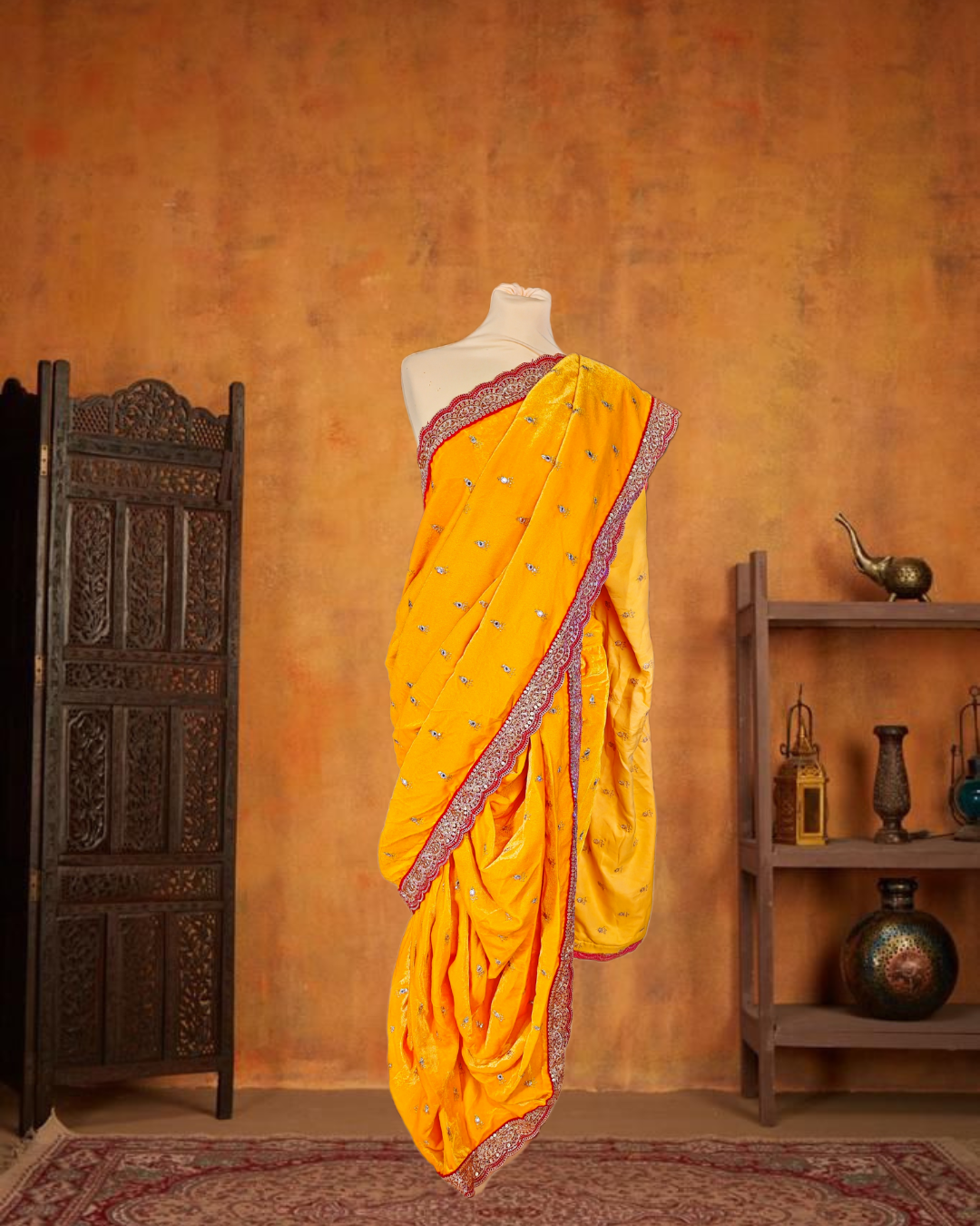 Crafted from premium, soft velvet, this saree offers a rich sheen that makes it perfect for evening events and winter weddings. The vibrant yellow hue, paired with a traditional intricate border, makes it an ideal choice for Haldi ceremonies, Gudi Padwa, or festive poojas.