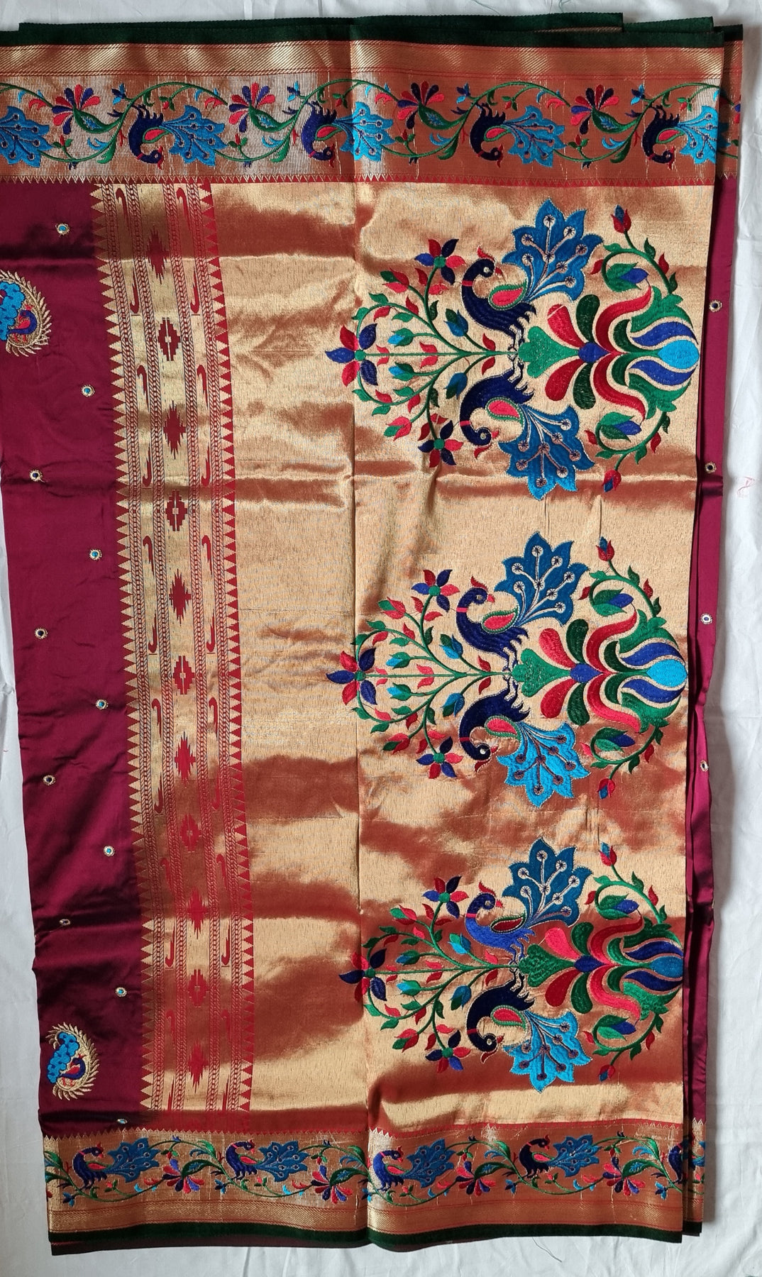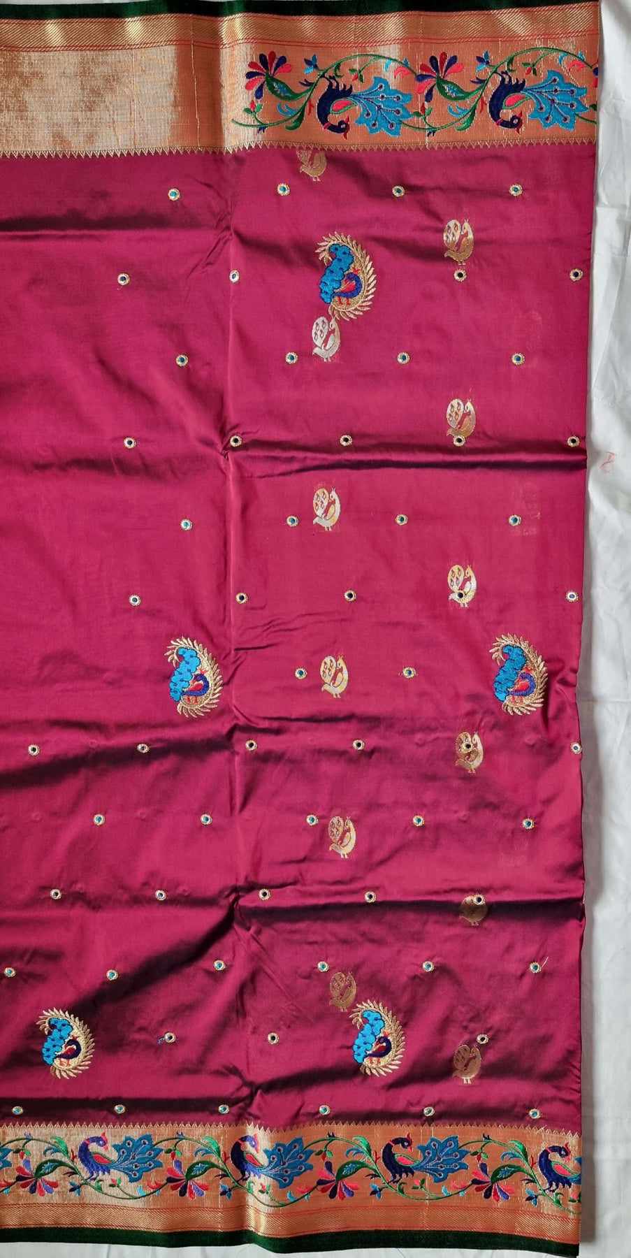 Paithani Silk Sarees with weaving golden buttas which has very rich pallu and border comes along with running blouse