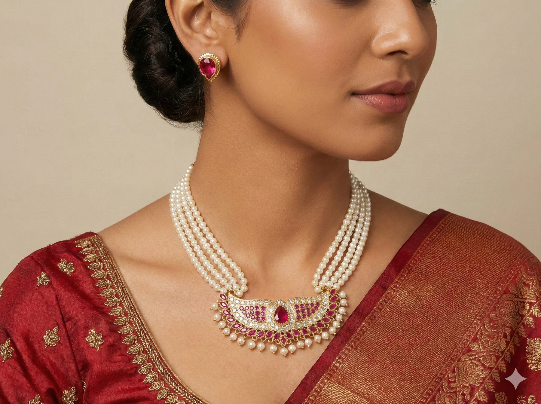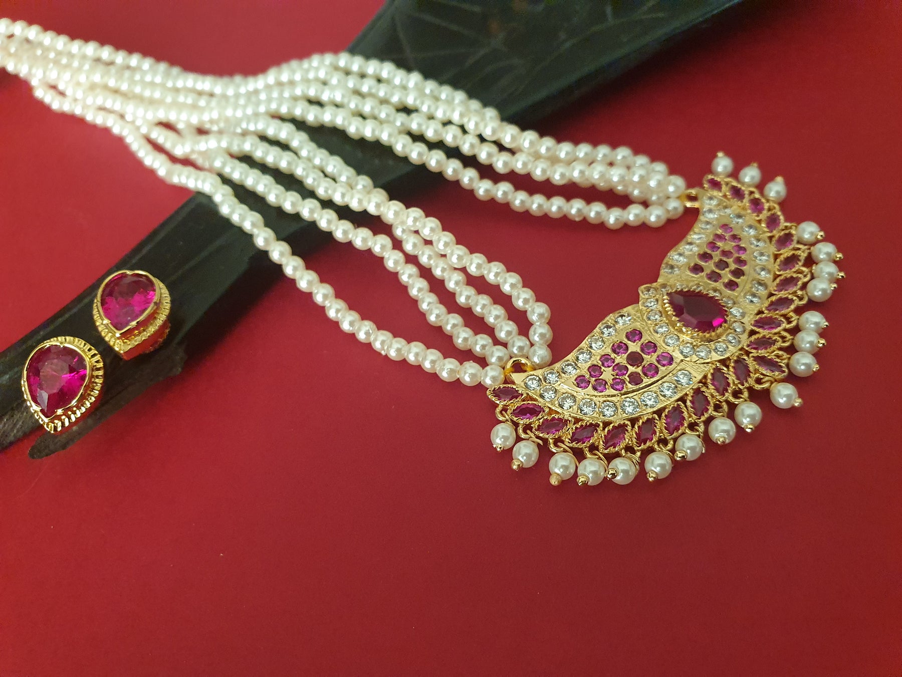Off white pearl necklace with American diamonds and faux kemp stones, in gold plating