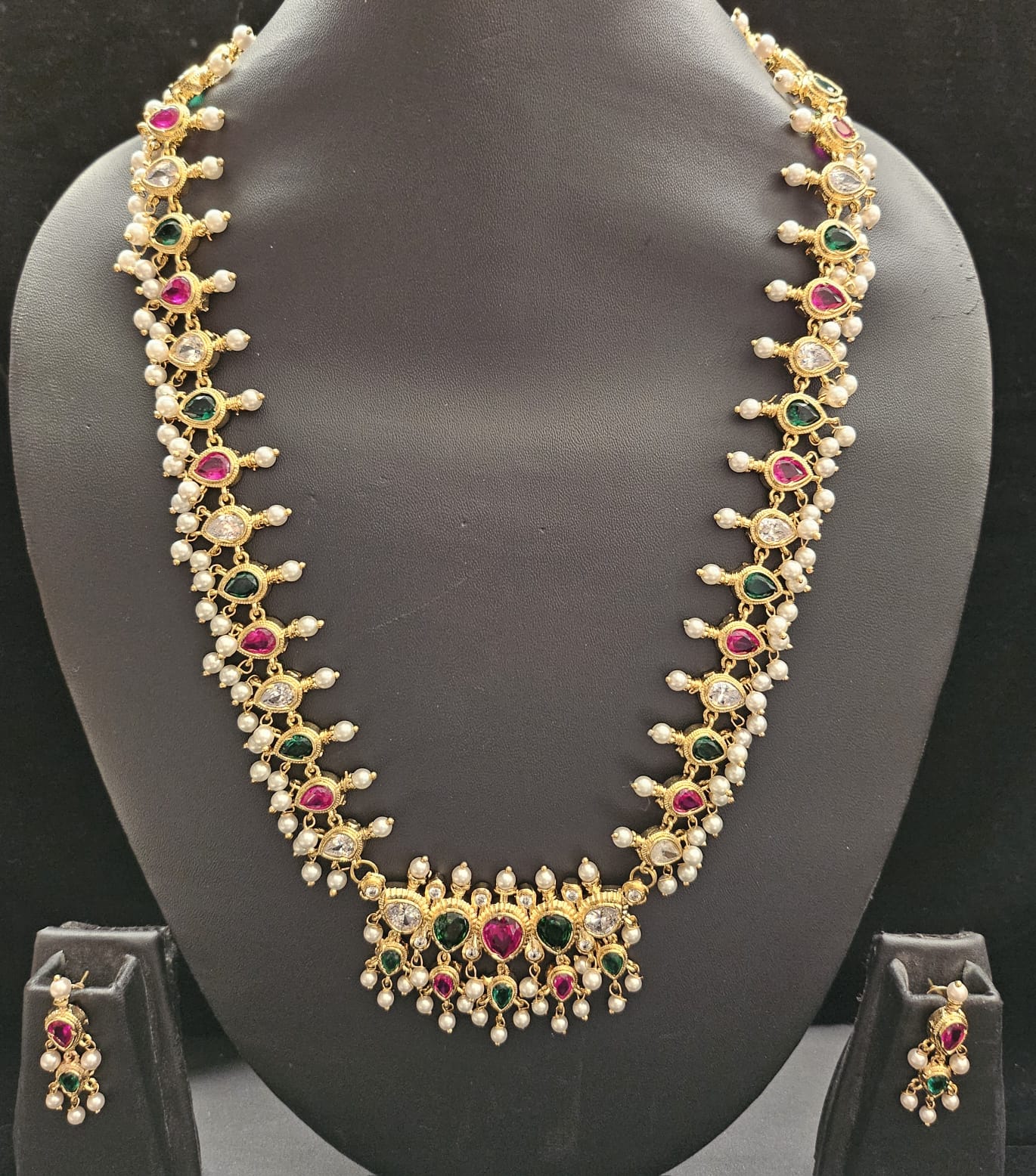 White pearl necklace with American diamonds and faux kemp stones, in gold plating