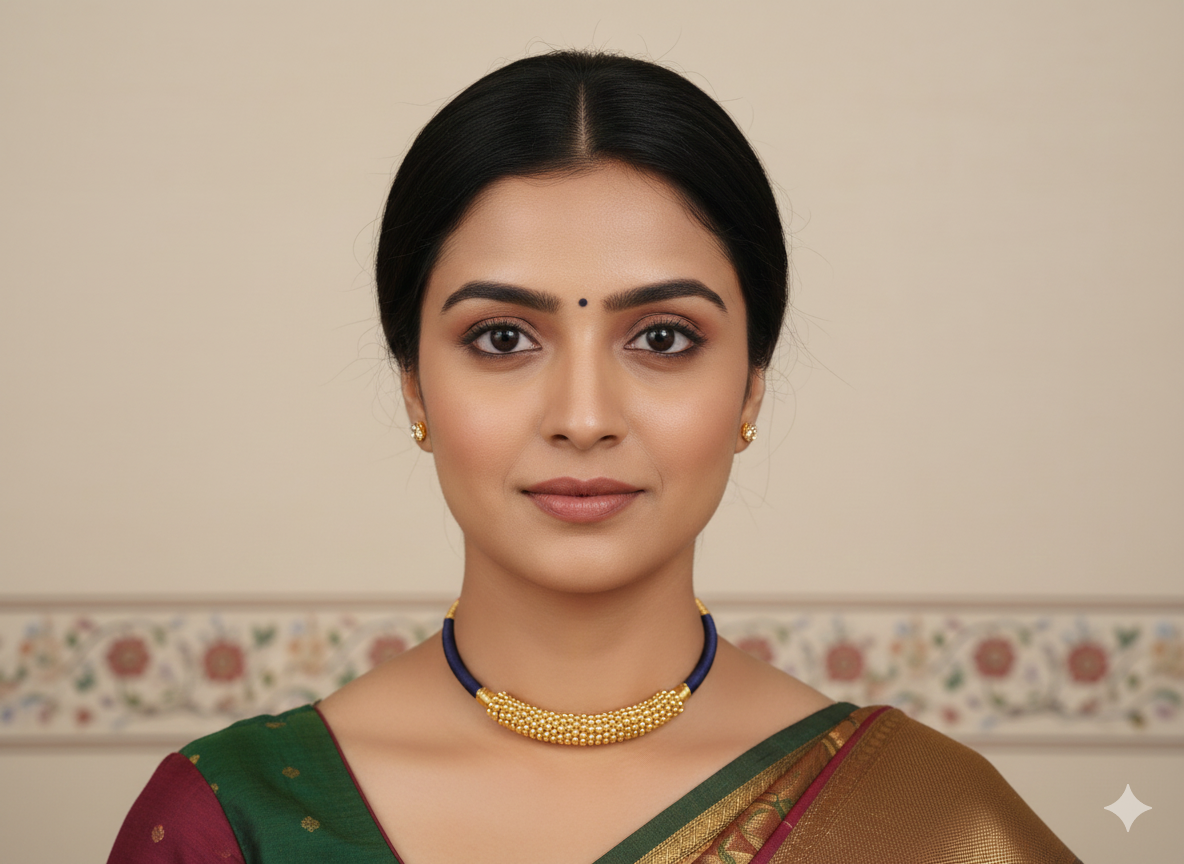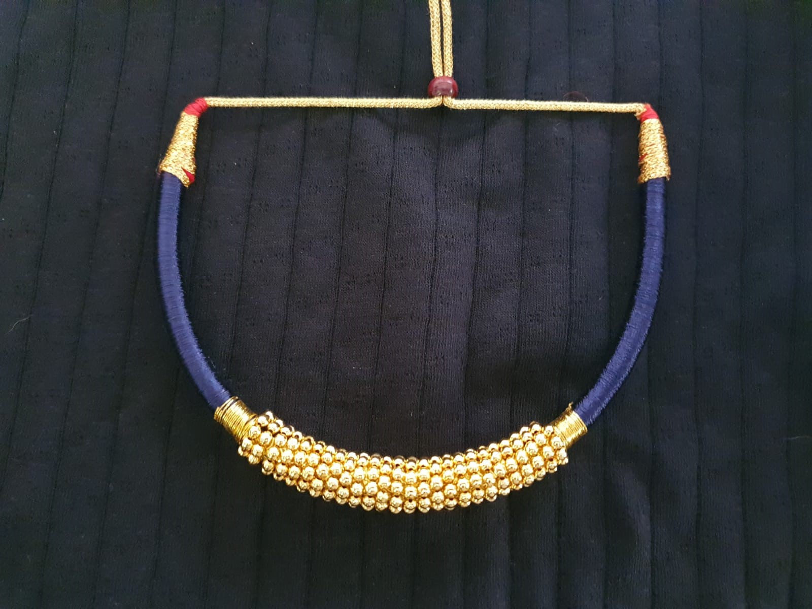 Traditional Maharashtrian Thushi (Choker) In midnight blue thread and golden beads.