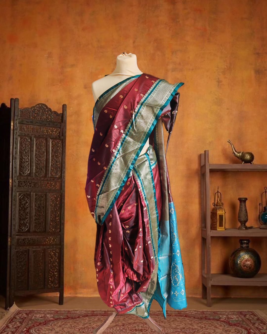 Whether you are in Mumbai, Pune, or attending a festive event in Dubai or the UAE, this saree ensures you carry the legacy of the Maratha women with pride. No need for bulky petticoats or hours of draping—just wear and shine.
