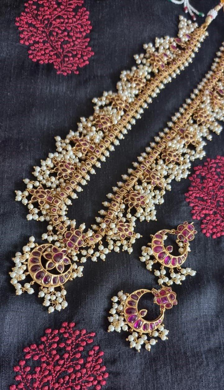 Beautiful ethnic necklace with pearls and faux kemp stones in golden finish with adjustable thread chain and matching earrings