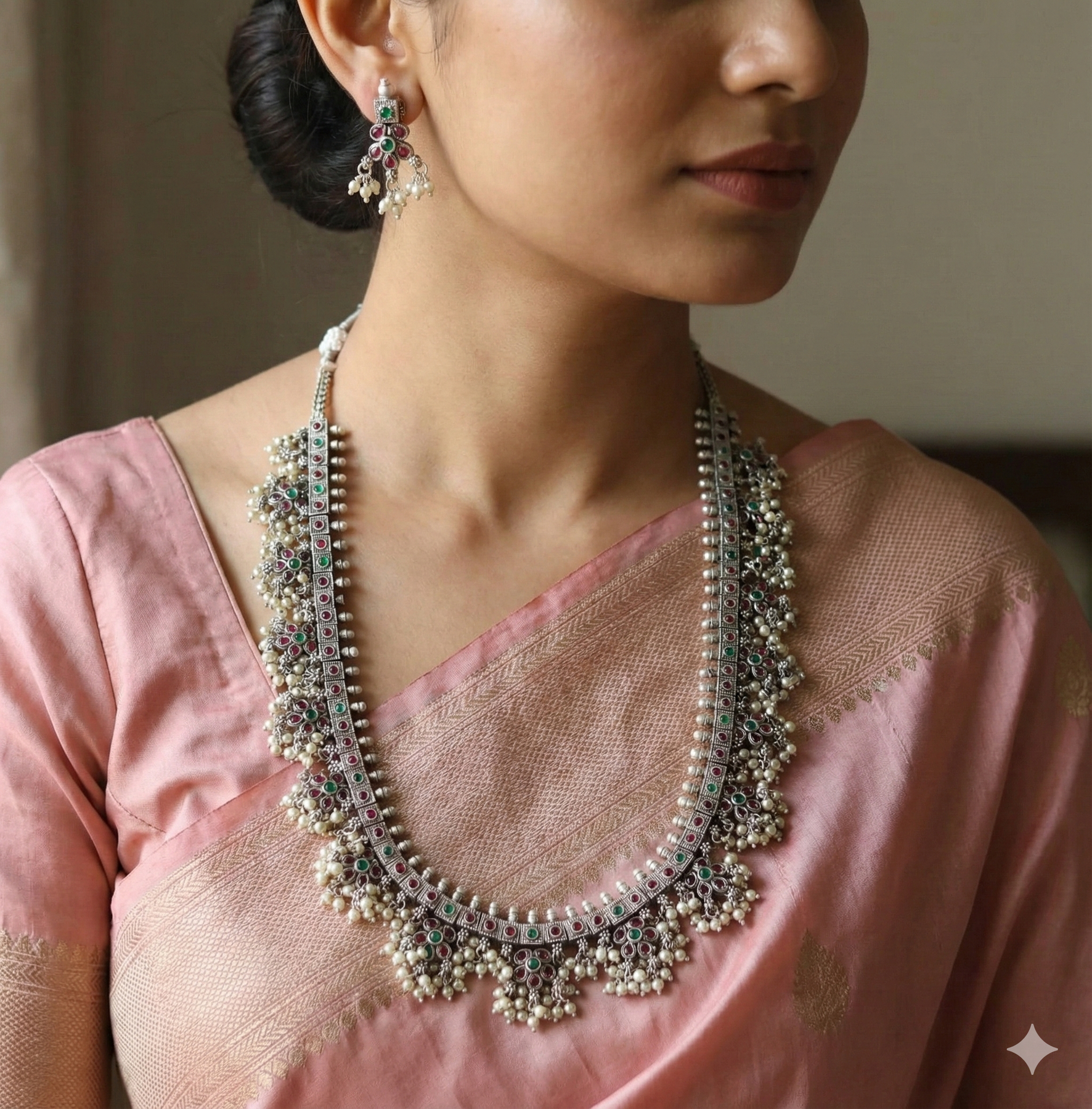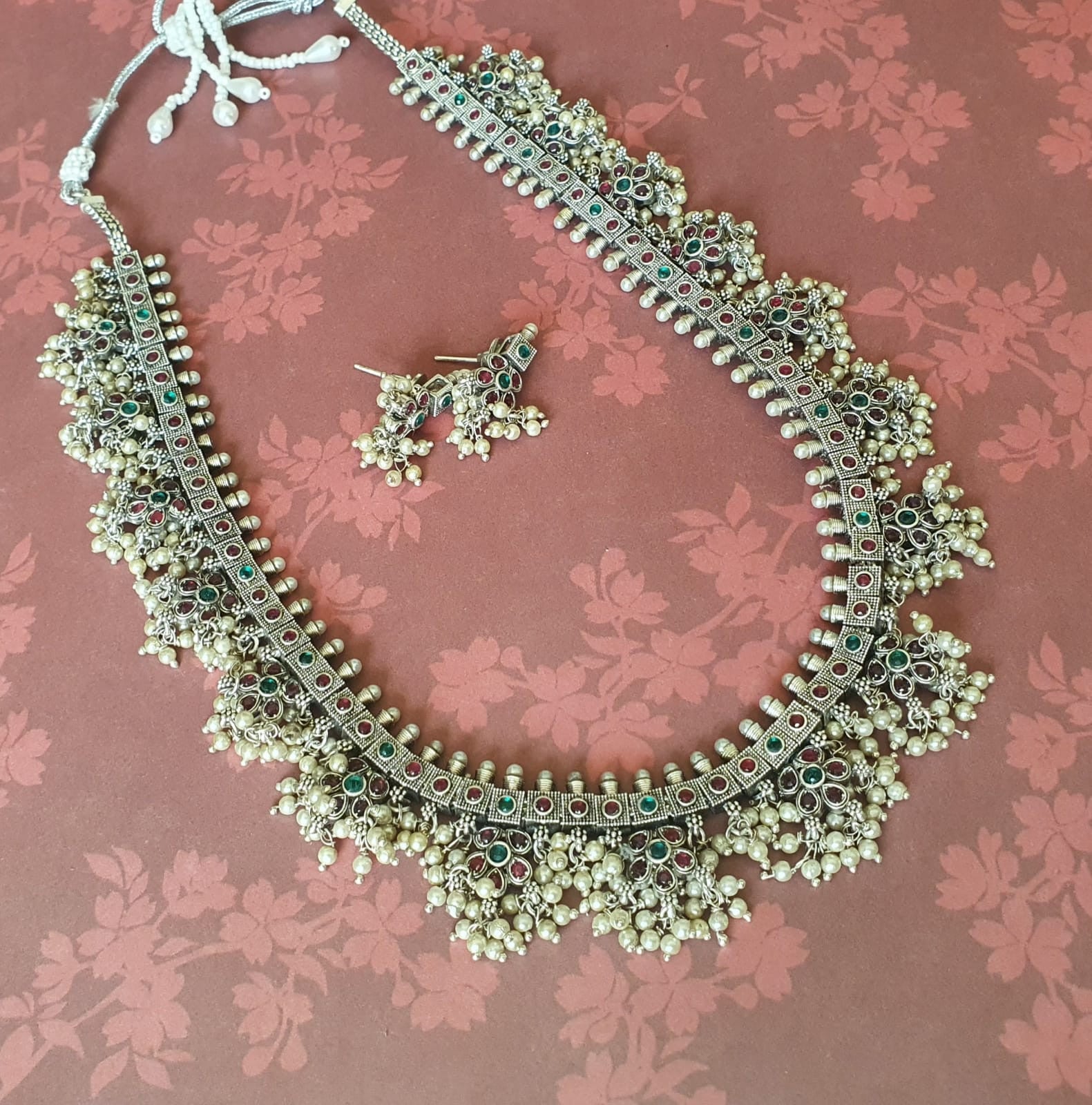 Beautiful ethnic necklace with pearls and faux kemp stones in silver finish with adjustable thread chain and matching earrings